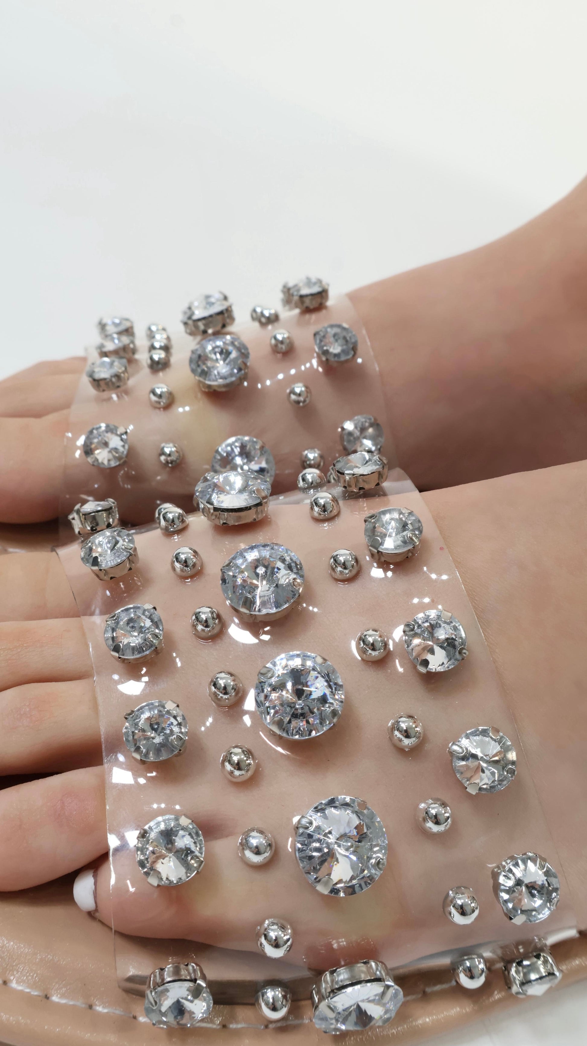 SANDALIA DE PISO STRAP GRUESO PLASTIFICADO TRANSPARENTE APLICACION DE PIEDRAS Y ESTOPEROLES SOBRE EL STRAP, EXACTO A LA TALLA