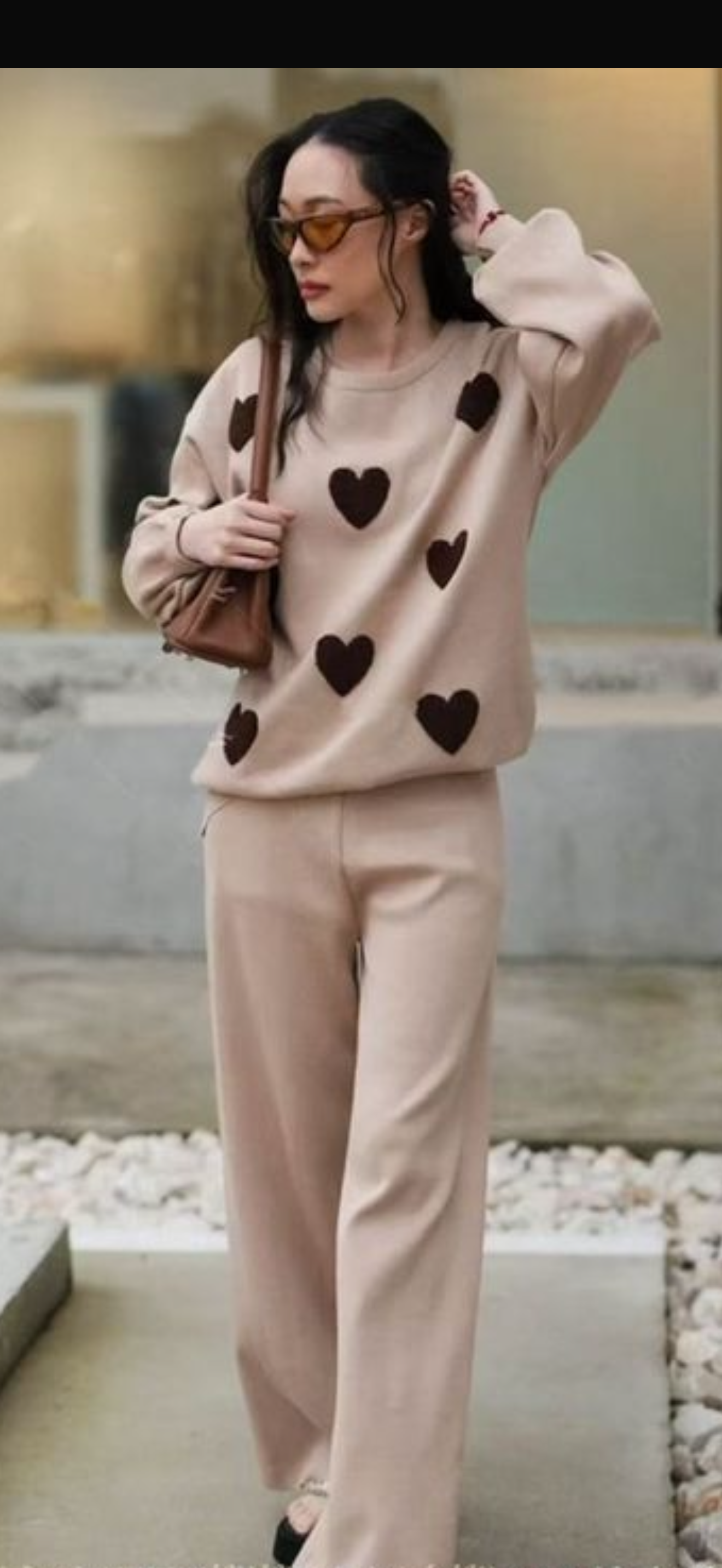 CONJUNTO DE 2 PIEZAS , EL PANTALÓN TIENE RESORTE, PIERNA AMPLIA CORTE RECTO, TELA DE PUNTO, UNITALLA ABARCA CH M, G DISEÑO CON CORAZONES EN EL SWETER