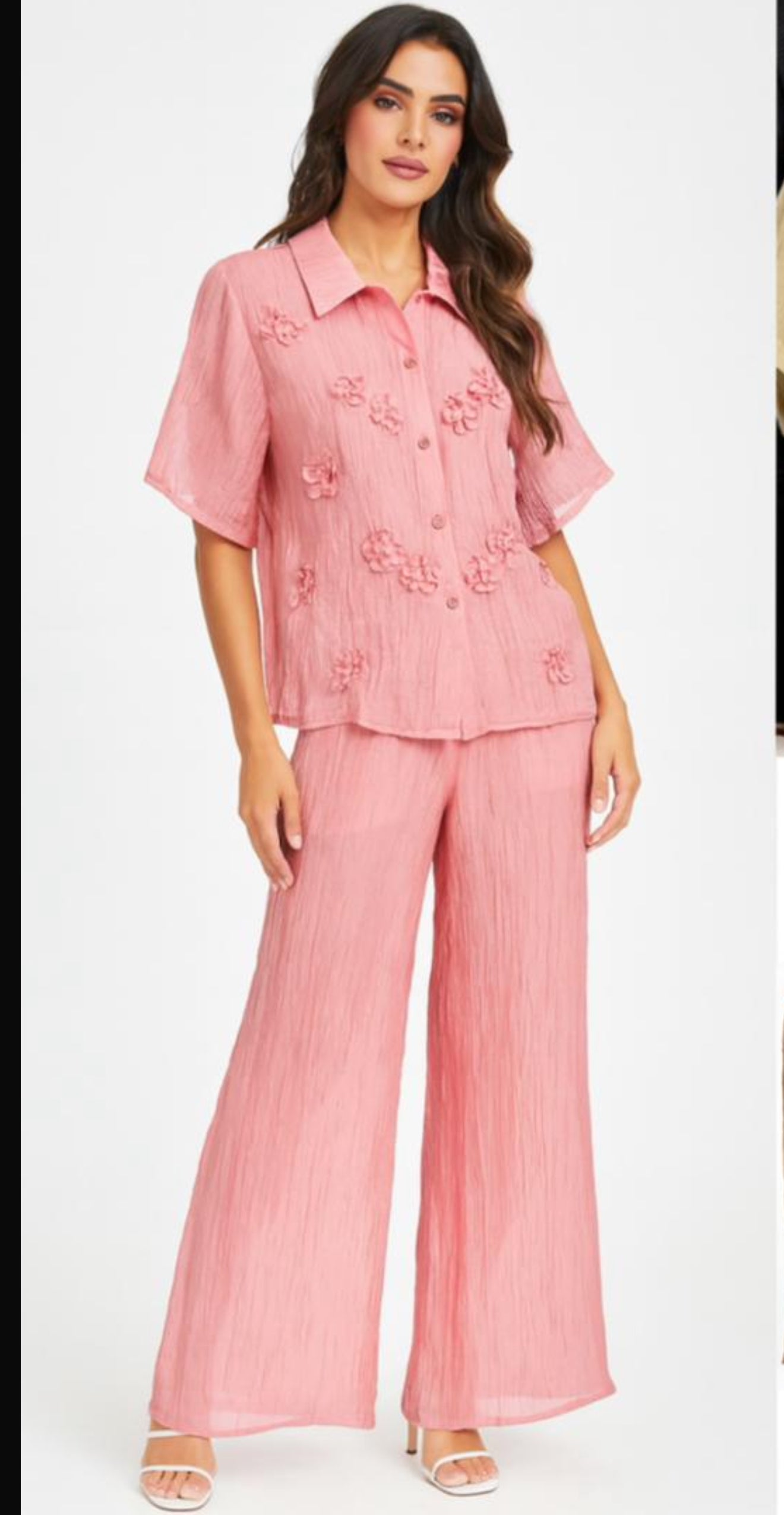 CONJUNTO DE 2 PIEZAS , EL PANTALÓN TIENE RESORTE, PIERNA AMPLIA CORTE RECTO, TELA DE ORGANZA, CH M, G BLUSA DE BOTONES CON FLORES BORDADAS, EXACTO A LA TALLA