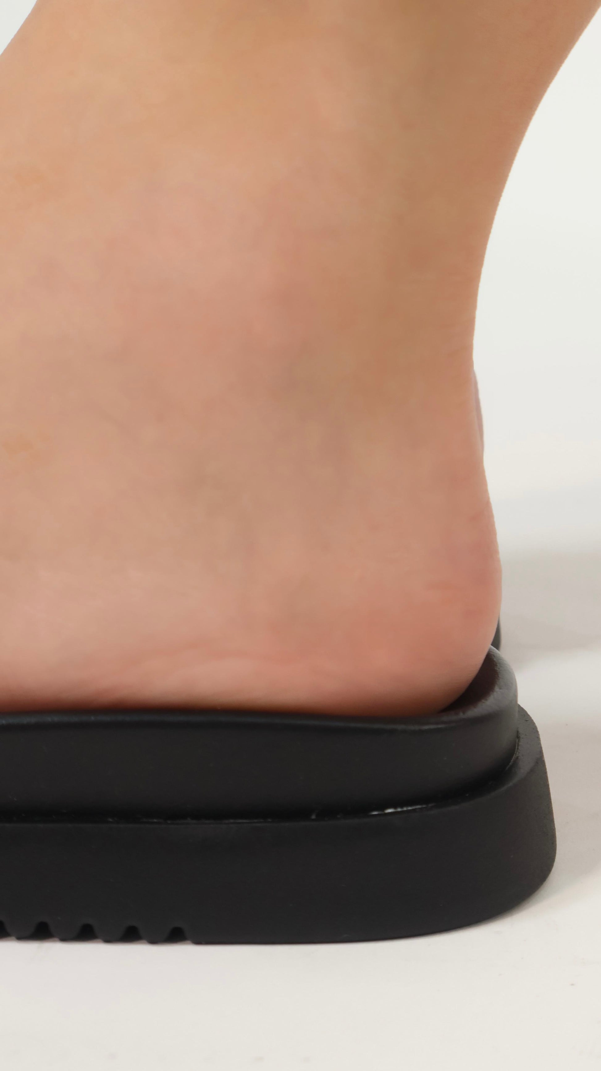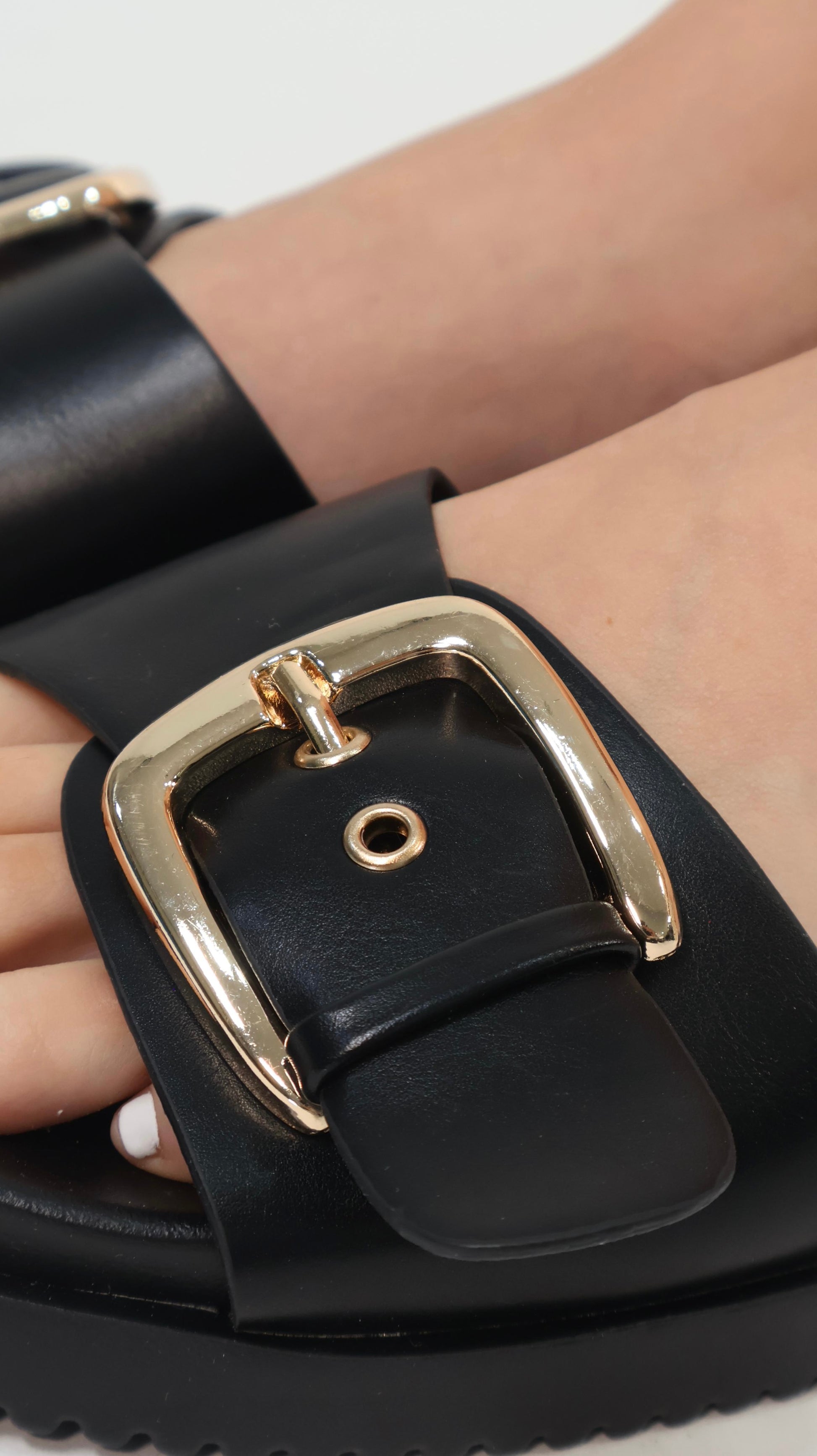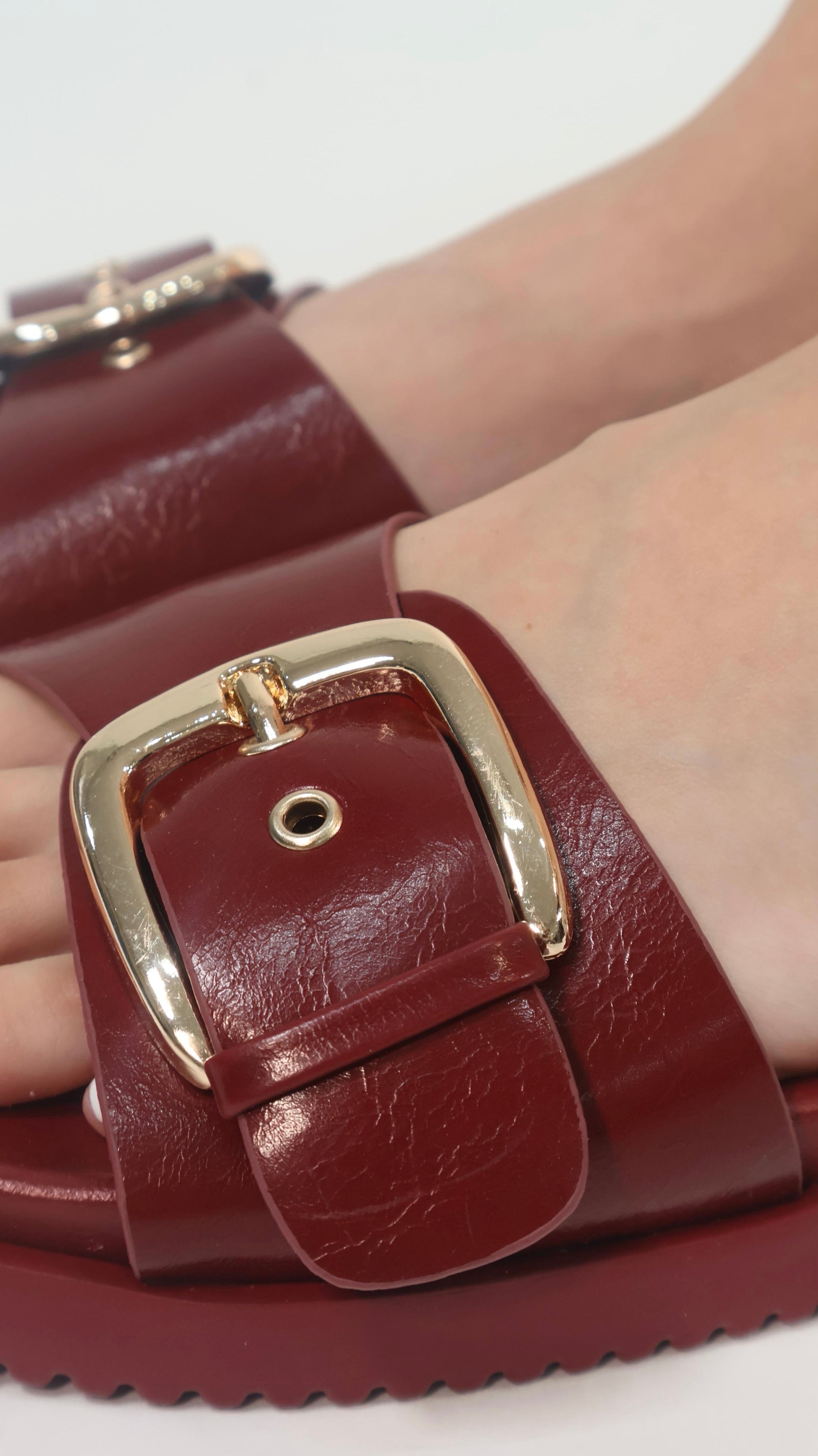 SANDALIA CHUNKY DE PISO, CON UN STRAP GRUESO AL FRENTE, DETALLE DE HEBILLA AJUSTABLE EN COLOR DORADO, EXACTO A LA TALLA