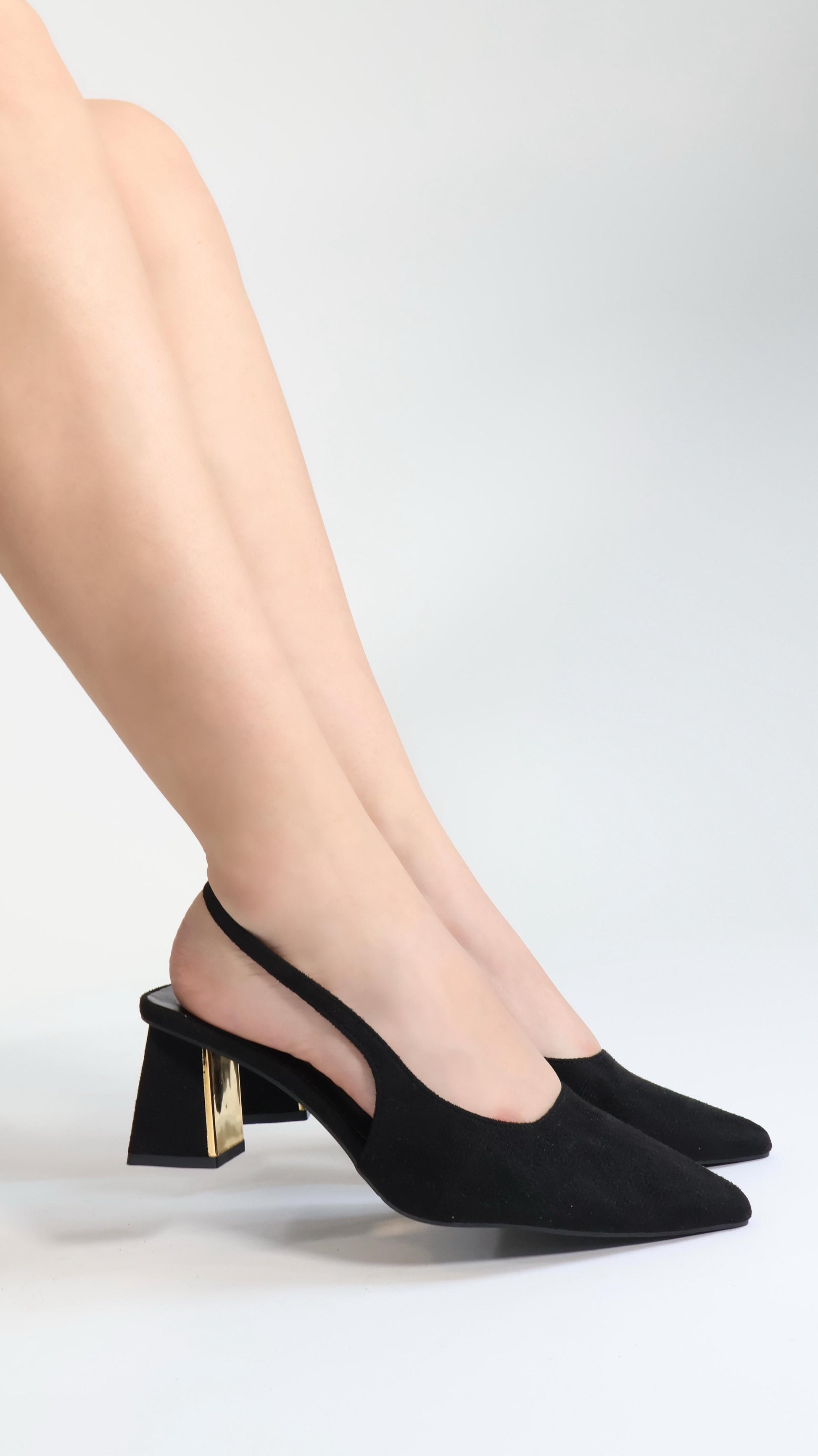 ZAPATILLA EN COLOR NEGRO, PUNTA PICUDA, CON TACON GRUESO DE 7CM DE ALTO, CON UN BORDE METALICO EN DORADO, MATERIAL DURAZNO, EACTO A LA TALLA