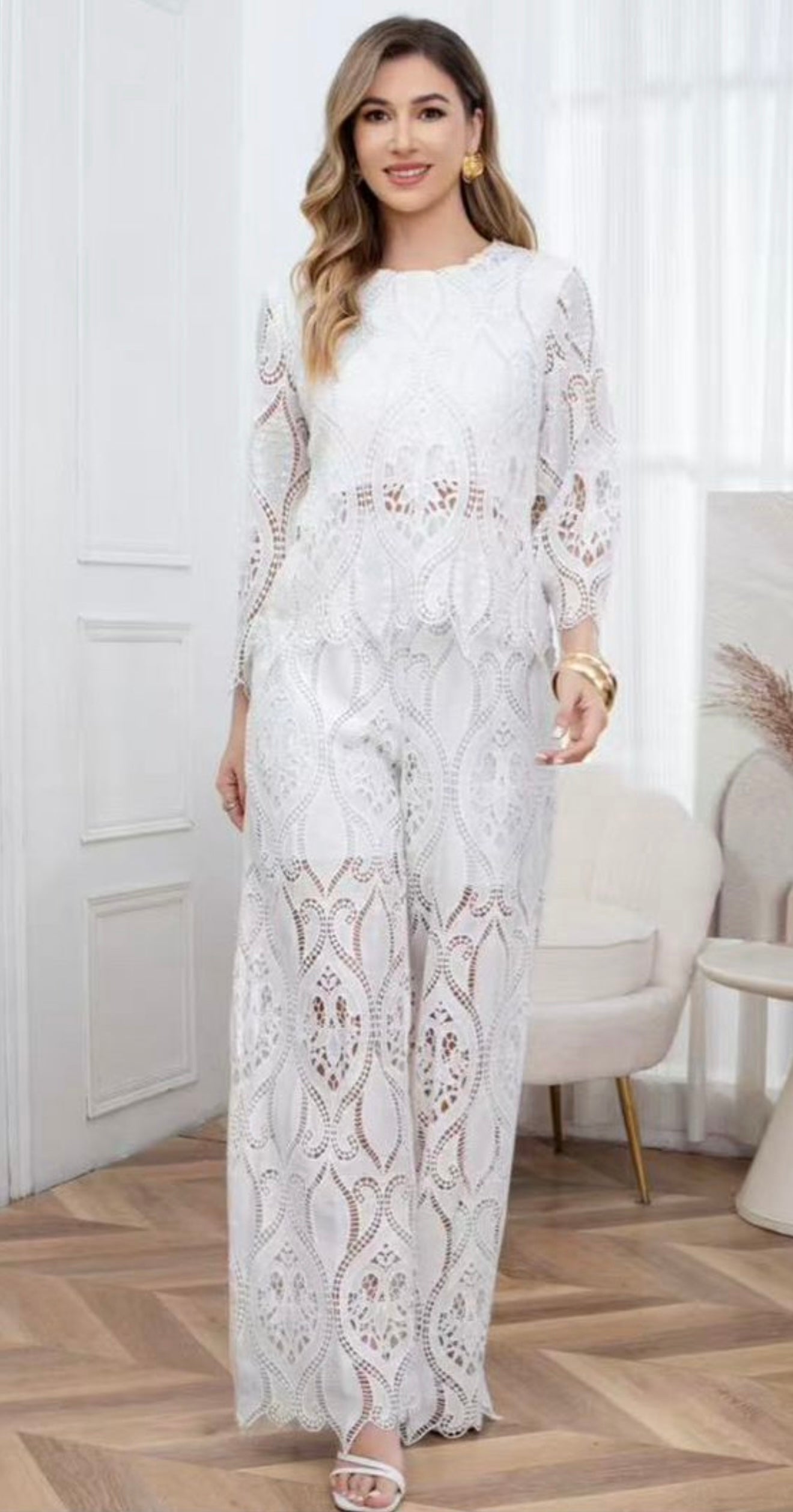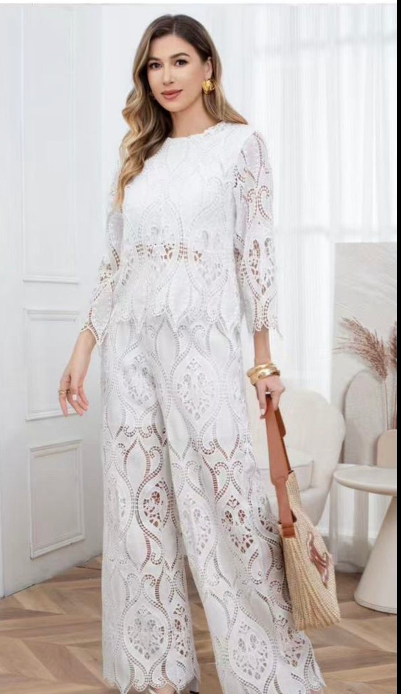 CONJUNTO DE 2 PIEZAS CON ENCAJE EN TODO EL DISEO, MANGA 3/4 , EL PANTALON TIENE SHORT INCLUIDO PARA EVITAR TRANSPARENCIAS