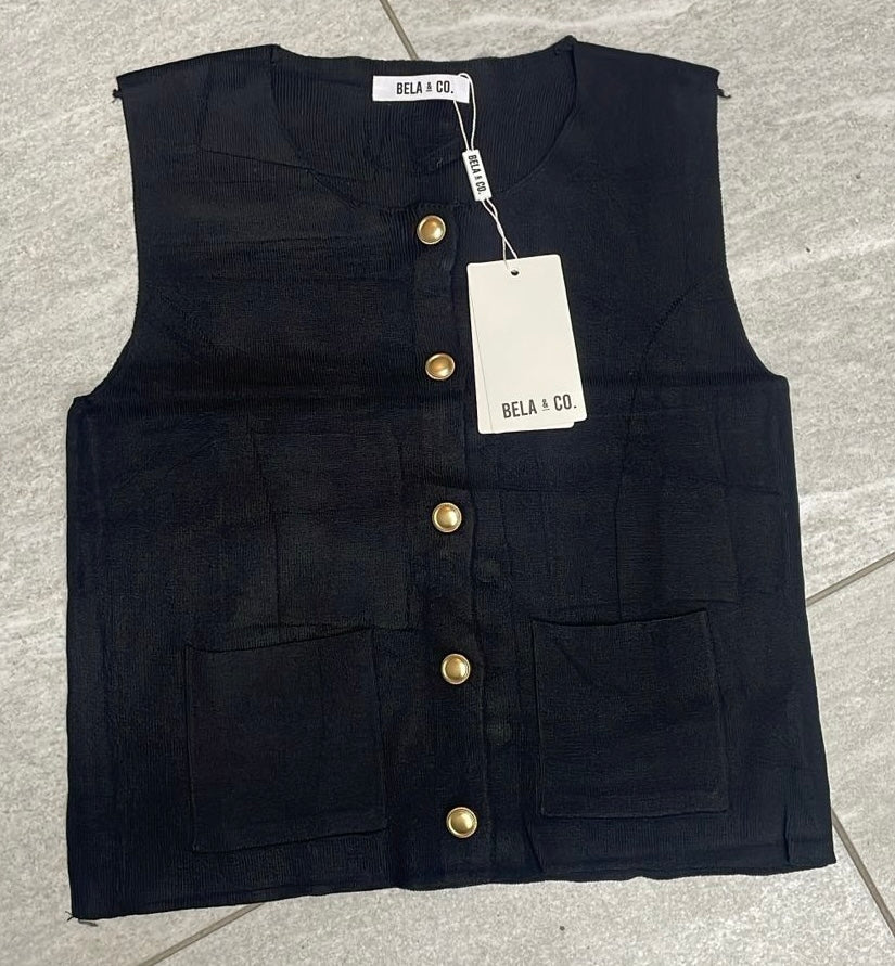 CHALECO DE TELA DE PUNTO, UNITALLA, CON BOTONES EN COLOR DORADO Y BOLSAS AL FRENTE