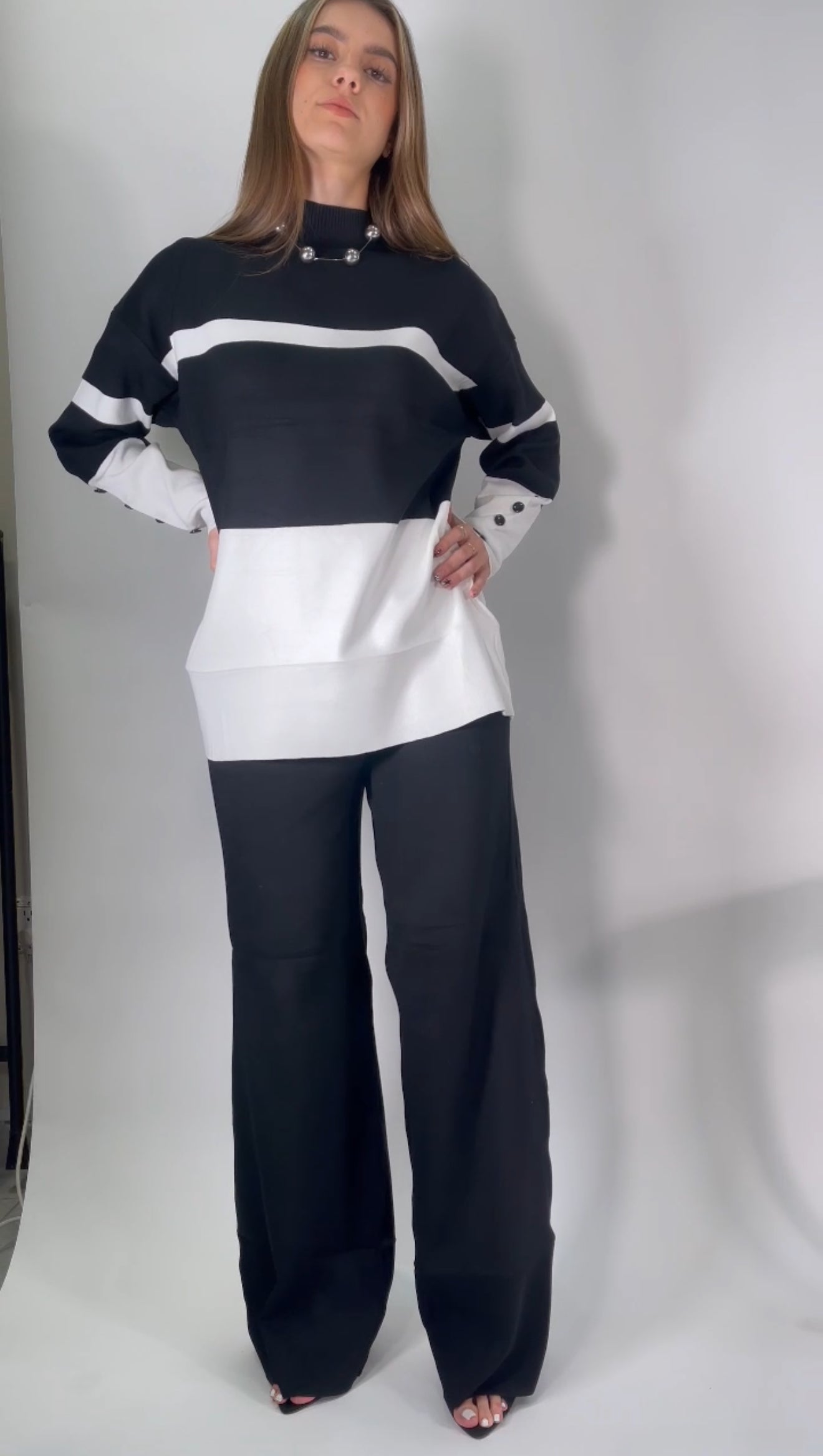 CONJUNTO DE 2 PIEZAS , EL PANTALÓN TIENE RESORTE, PIERNA AMPLIA CORTE RECTO, TELA DE PUNTO, UNITALLA ABARCA CH M, G DISEÑO EN LINES HORIZONTALES DE DIFERENTES GROSORES