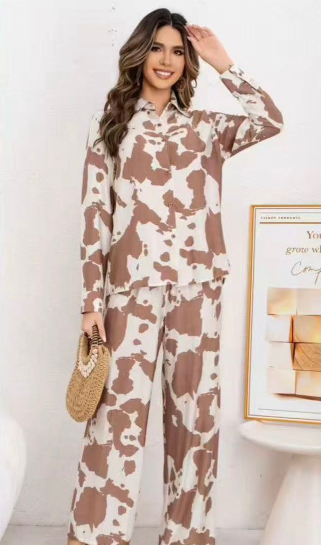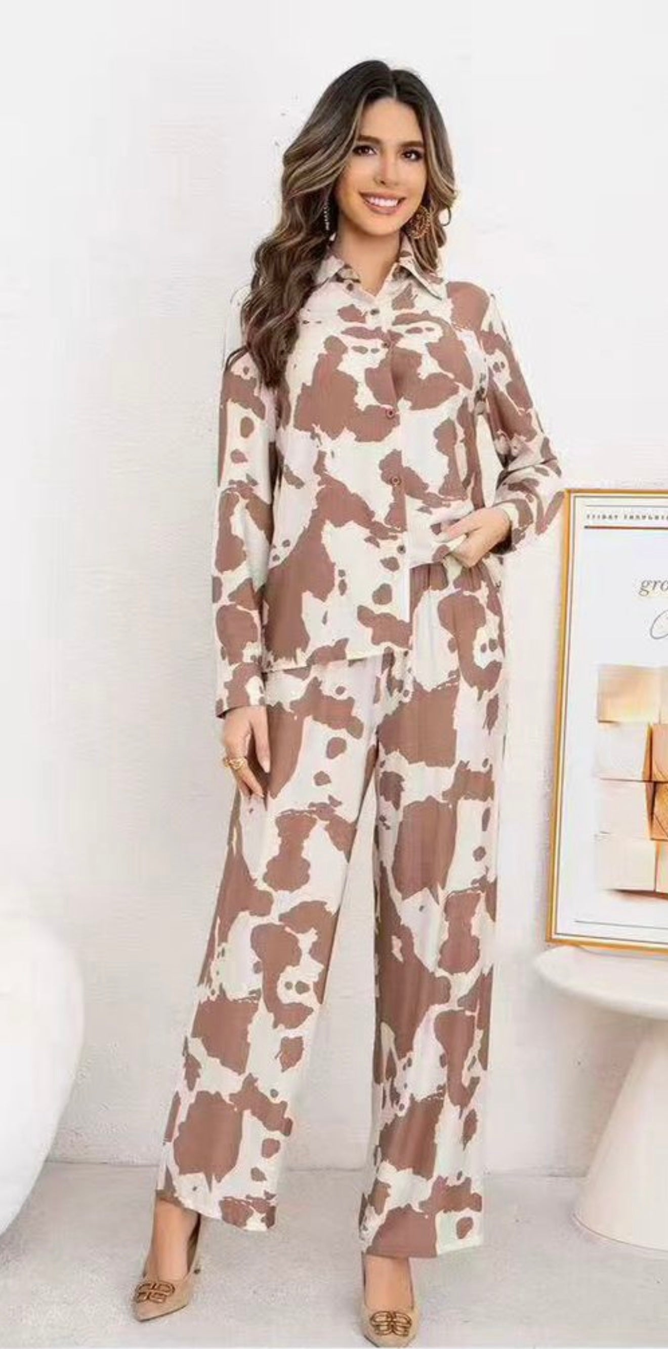 CONJUNTO DE 2 PIEZAS, CON ESTAMPADO DE VACA PANTALON PIERNA AMPLIA CORTE RECTO CON RESORTE EN LA CINTURA TELA FRESCA